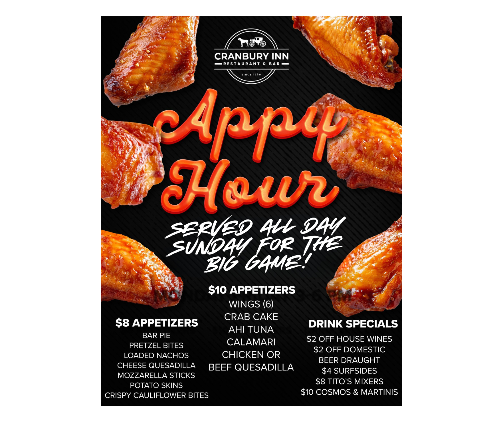 OrderGift cardsCateringWe can't wait for The Big Game on Sunday! Join us for awesome game day food and drinks! APPY HOUR MENU ALL DAY LONG! We have our take out big game specials out. click below to order!