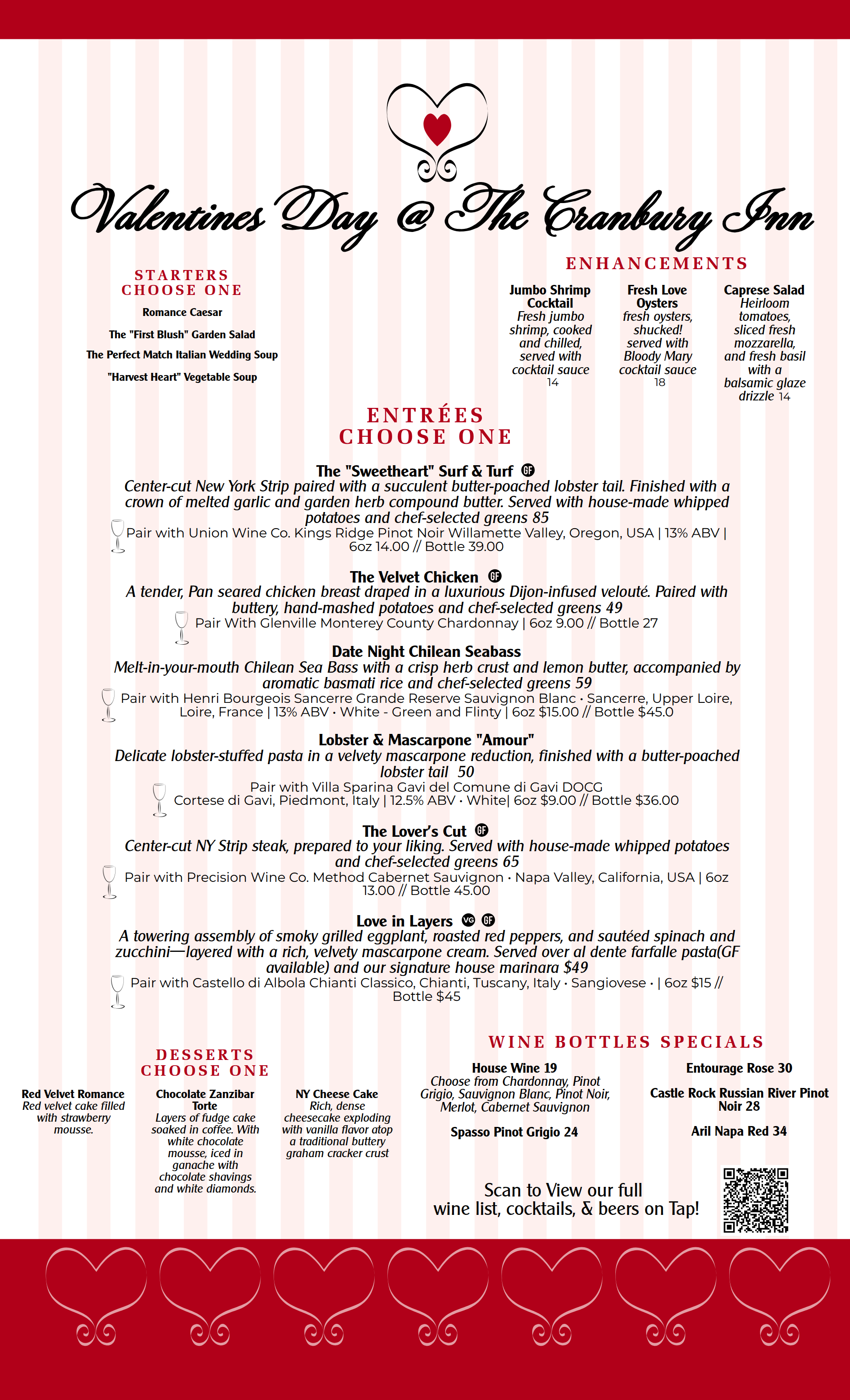 Valentine's Day @ The Cranbury Inn Saturday February 14th Come Join us for Valentine's Day @ The Cranbury Inn Special 3 course menu curated by our Chef!