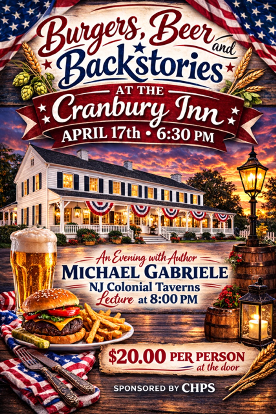 Join us April 17th for Burgers, Beers, and Backstories with the author of Colonial Taverns of New Jersey, Michael C. Gabriele. Enjoy captivating stories that bring New Jersey's past to life.